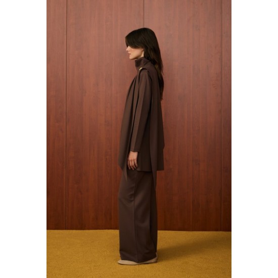 Pantolon düz paçalı ve geniş kesimlidir, rahat kalıptadır.