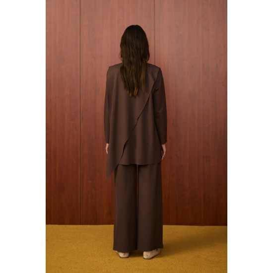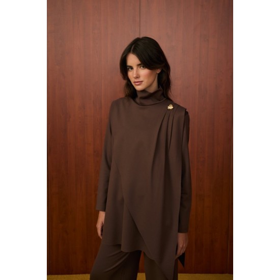 Üst parça asimetrik kesime sahip olup, omuz kısmında dekoratif metal düğme detayı bulunmaktadır.