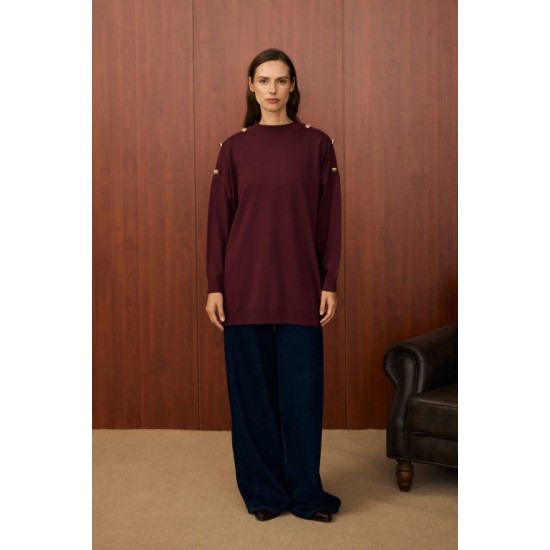 Minimal ve zarif duruşuyla dikkat çeken bu triko tunik, omuz ve kol detaylarındaki altın renkli düğmelerle modern bir hava kazanıyor. Salaş kesimiyle rahatlık sunarken, kaliteli iplik karışımı sayesinde dört mevsim kullanım için uygundur.